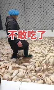 畫面中,一位身著深色棉衣、頭戴藍色發帽、穿著疑似防水工作褲的女性,正站立于一片浸泡在渾濁液體中的禽類屍體之上。