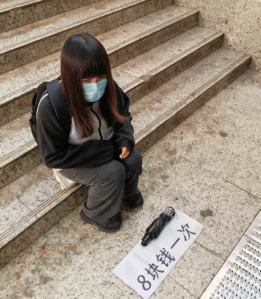 她面前擺著一張白紙,紙上「8塊錢一次」的黑色大字格外醒目,旁邊放著從未撐開的黑色雨傘。