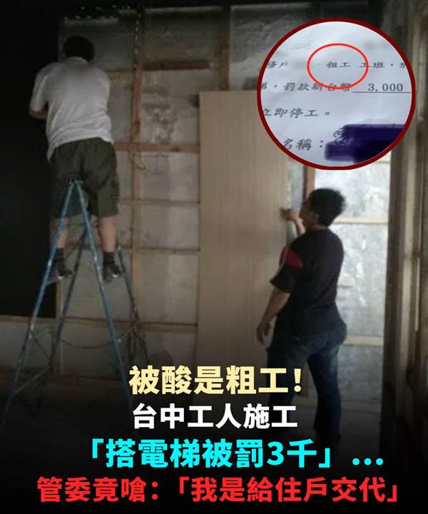 被酸是粗工!台中工人施工「搭電梯被罰三千」...管委竟嗆:「我是給住戶交代」