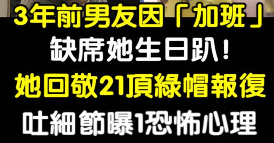 三年前男友「加班」缺席生日趴!她回敬「21頂綠帽報復」吐細節曝一恐怖心理,網友嚇歪:天啊好惡心