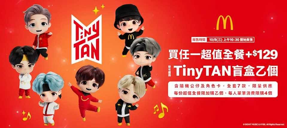 麥當勞宣布與韓國人氣團體防彈少年團(BTS)合作,推出全新的「TinyTAN盲盒」系列,每套包含7款可愛角色,並附有雙面人物小卡。此系列將于10月8日起正式開賣,消費者每單次購買最多可限購4個盲盒。