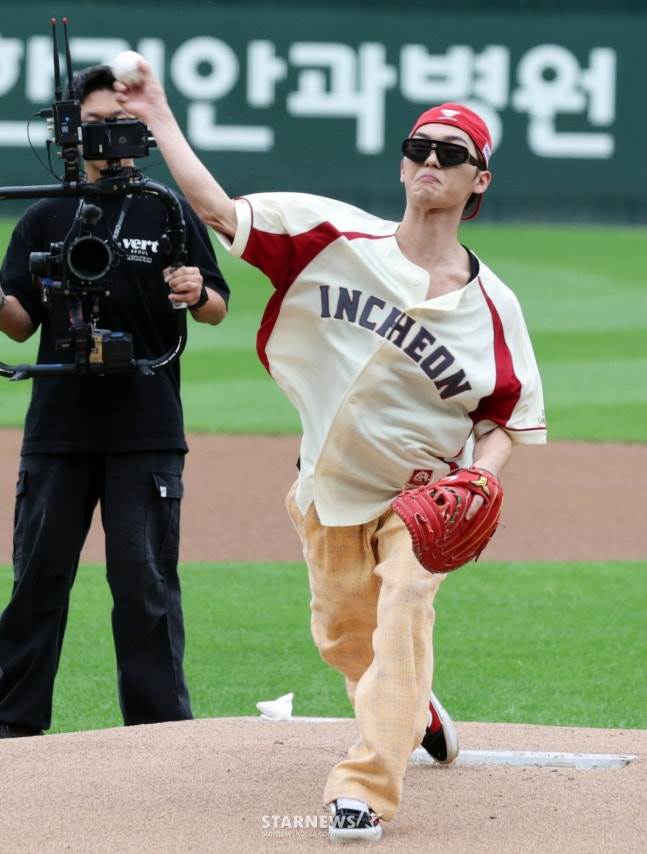 作為知名的SSG鐵粉,崔顯旭曾就讀江陵高中,是前棒球選手出身,直到高一仍是校隊成員。去年他也曾在SSG主場比賽中投出高速球式的開球,引發熱議。當天,他戴著墨鏡、配上捕手手套登場,在投手丘上展現了前選手的實力。