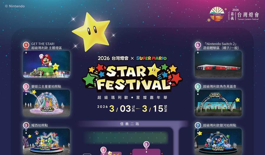 2026 台灣燈會即將于 3 月 3 日(二)~3月15日(日)在嘉義縣登場,本屆「光遊嘉義・超級有型 SUPER STYLE」首度與「超級瑪利歐」合作,推出「2026 台灣燈會 × 超級瑪利歐・星燦嘉年華」,以《超級瑪利歐》系列角色與經典元素為主題規劃燈區內容。