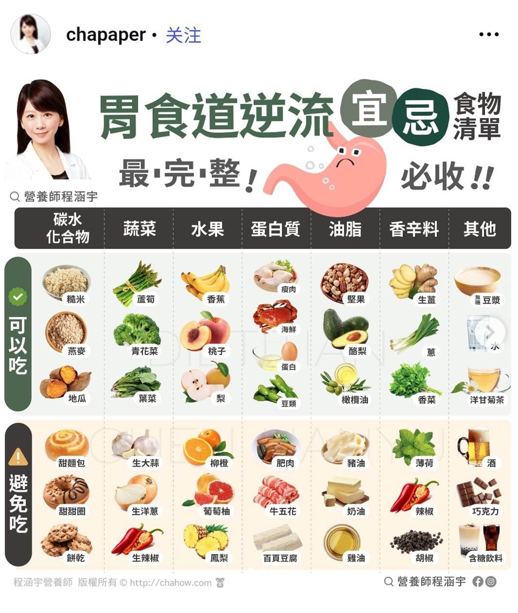 營養師程涵宇曾在社群平台分享,胃食道逆流族群在飲食上應掌握「均衡、低脂、高纖」三大原則,並從食材選擇與烹調方式著手,才能減少胃部負擔、降低逆流發生的機率。