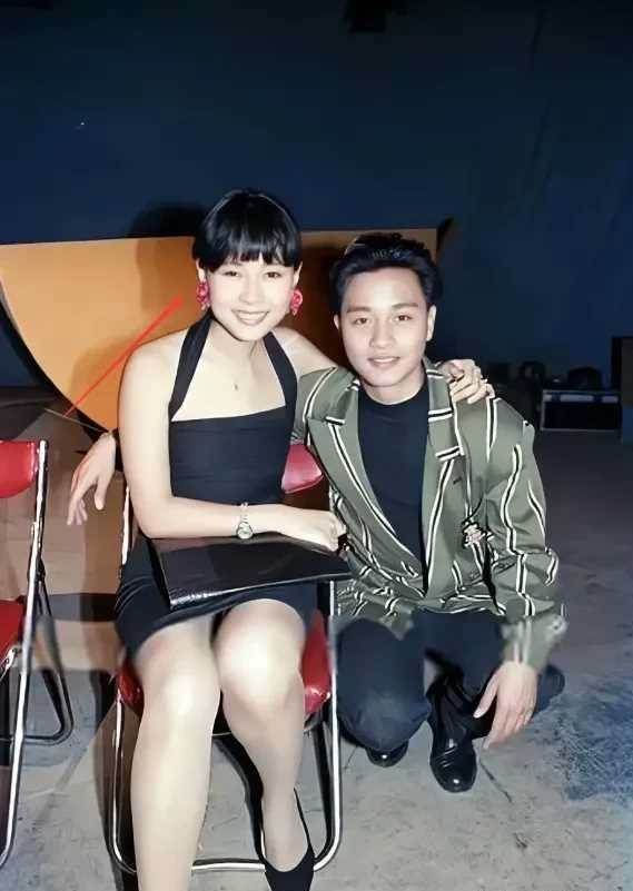 照片中的張國榮一身時髦裝束,蹲在她身旁,臉上帶著微笑,仿佛在向觀眾展示著二人之間的默契與親密。