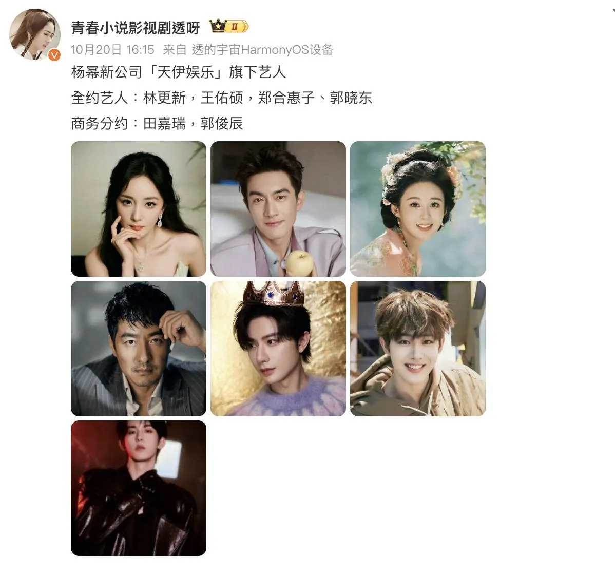 據悉,「天伊娛樂」由楊冪與母親共同創立,業務范圍涵蓋藝人經紀與影視投資等領域。網路上流傳的簽約名單包括林更新、王佑碩、鄭合惠子、郭曉東,以及以商務分約形式合作的田嘉瑞與郭俊辰。消息一出,立刻引起網友熱烈討論,認為楊冪的新公司勢必成為中國演藝圈的新勢力。不過,天伊娛樂方面尚未正式回應簽約名單的真實性。