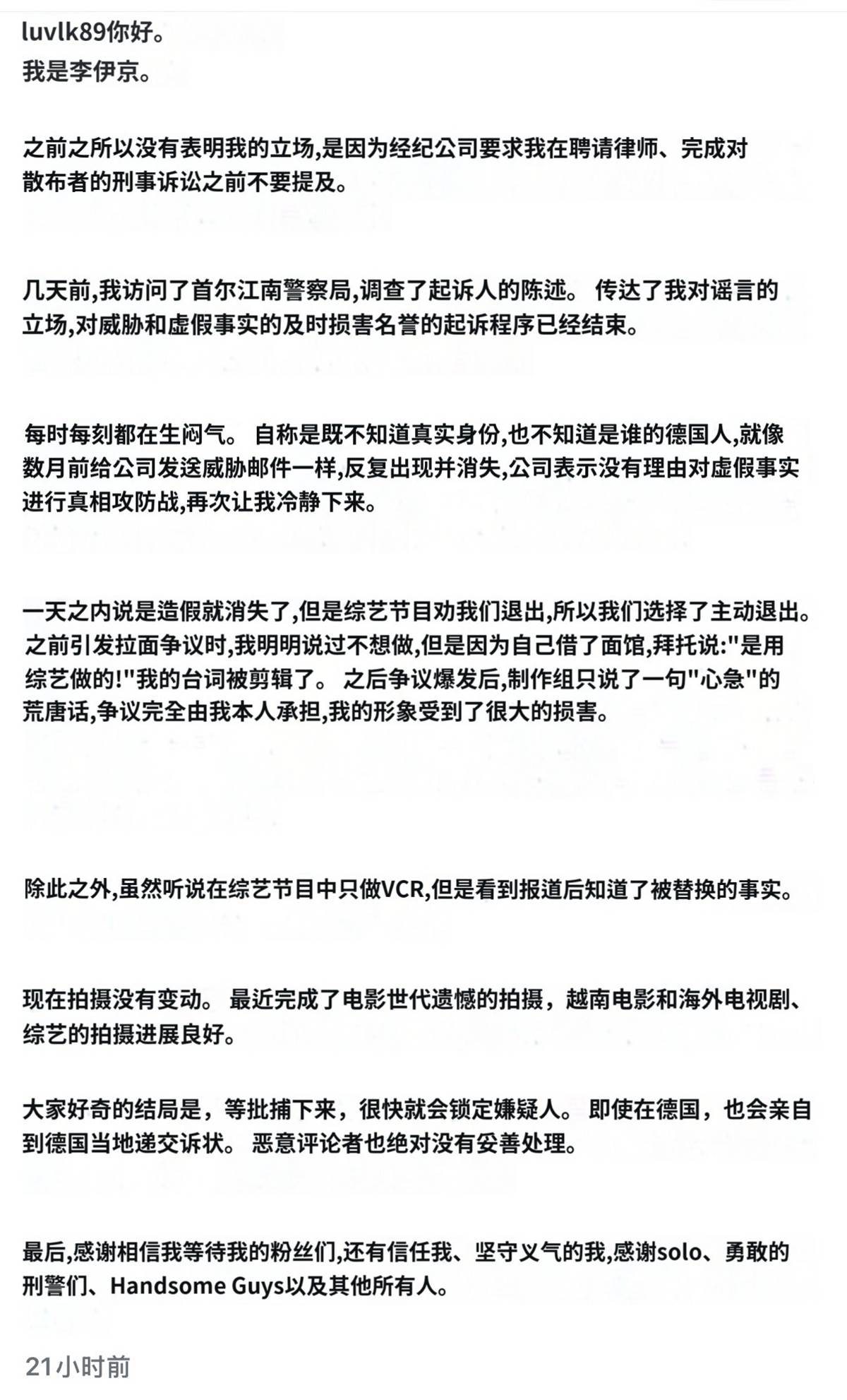 昨日李伊庚在 IG 發文,強調自己長期以來都在準備對爆料者提起法律行動。他表示:
