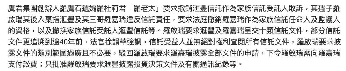 然而,這項申請已經遭到法院拒絕,駁回了他要求羅嘉瑞披露全部文件的申請,并且要求他向羅嘉瑞支付訴訟費,言下之意,羅老太及其小兒子又失利了。