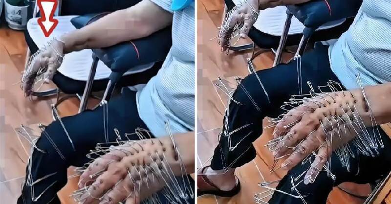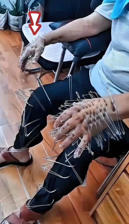 照片中,該男子從手掌到手臂,再到小腿,密密麻麻地扎著數十個銀色曲別針,部分扎針處的皮膚已經呈現烏青色,看著令人觸目驚心。