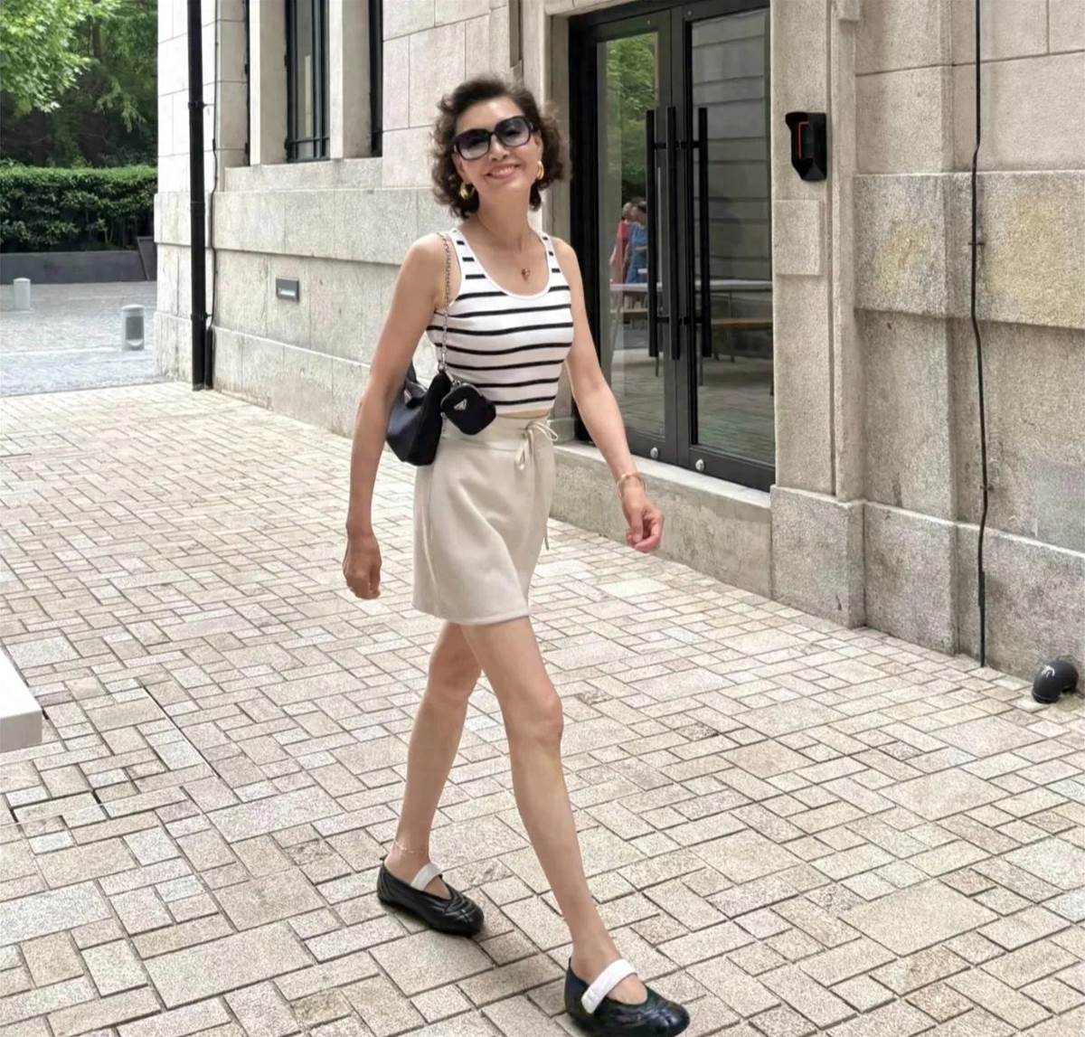 一件高腰的條紋背心,小農奶奶搭配了一條休閑短款,這身打扮既適合運動,又能穿出門,看著年輕又時尚。