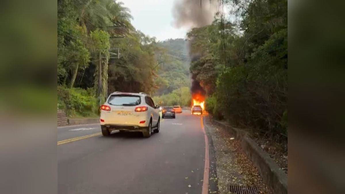 山路旁,一輛小客車突然起火燃燒,火勢猛烈,濃煙直竄天際,差一點就燒到一旁樹林。路過民眾紛紛停下車察看,警消獲報後立即派出水車趕往現場滅火。