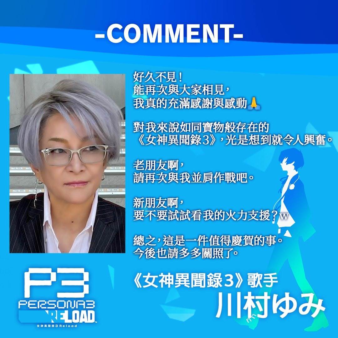 SEGA 與 ATLUS 宣布,由 2009 年發售的《女神異聞錄 3》初代主唱川村ゆみ所演唱的 8 首音樂,將收錄于《女神異聞錄 3 Reload》的更新檔中。此更新檔將于 Nintendo Switch 2 版發售日,也就是 10 月 23 日(四),在全平台(Xbox/PS5/PS4/Steam/Nintendo Switch 2)同步推出。