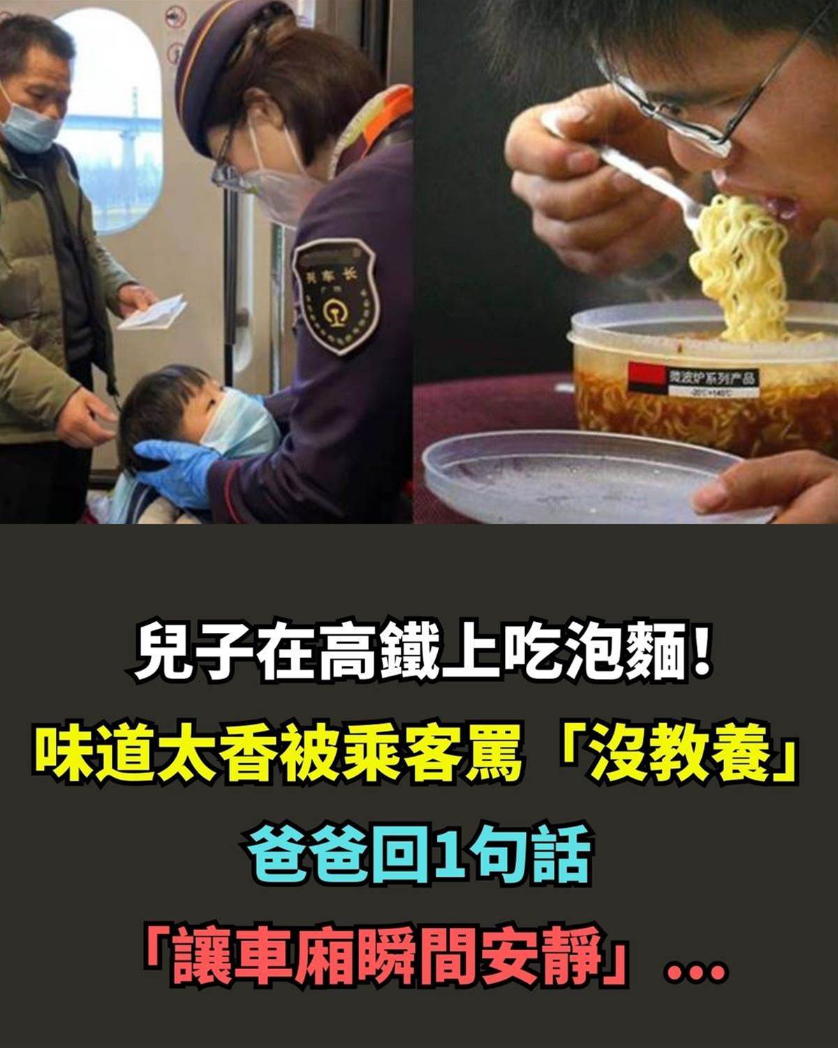 兒子在高鐵上吃泡麵!味道擴散被乘客辱罵「沒教養」爸爸回一句話「理性又霸氣」令其當場噤聲