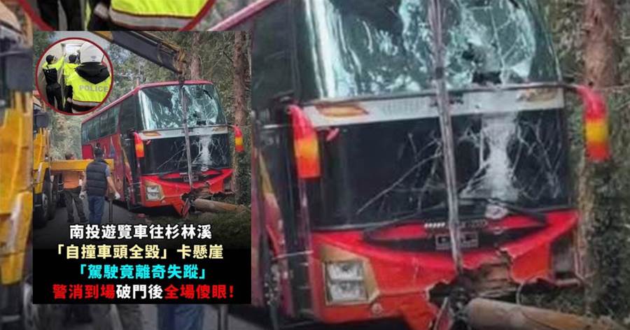 南投遊覽車往杉林溪「自撞車頭全毀」卡懸崖「駕駛竟離奇失蹤」警消到場破門後全場傻眼!