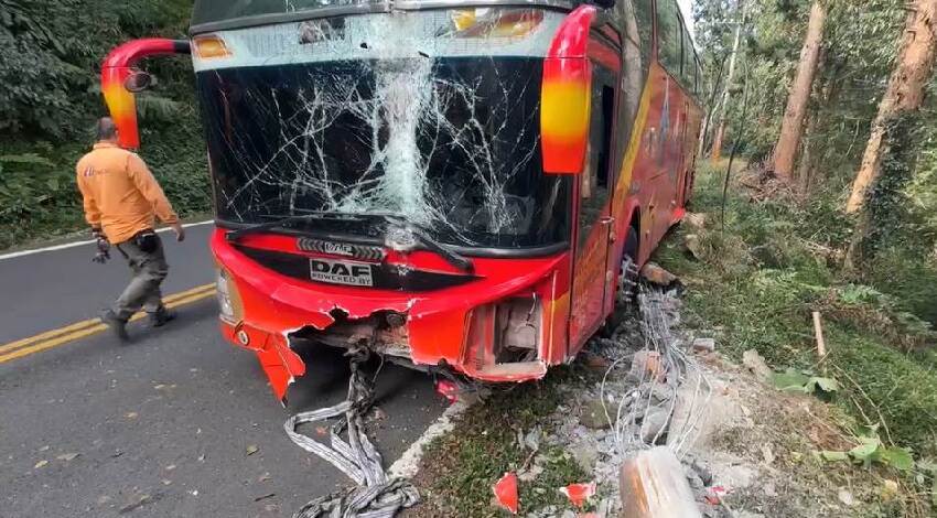 一輛遊覽車行經南投興產路準備前往杉林溪,途中不明原因跨越雙黃線自撞電線桿,導致擋風玻璃碎裂,車頭嚴重毀損。