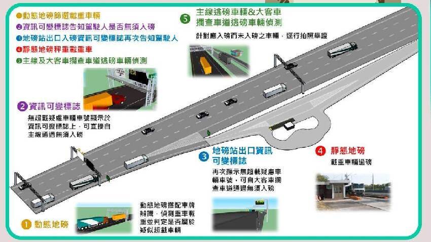 為提升大貨車過磅效率並防止超載與逃磅現象,交通部高速公路局宣佈自3月1日起,國道主線將新增3處動態地磅系統正式啟用,分別位于國道1號員林北向、國道1號新營北向以及國道3號龍潭南向。