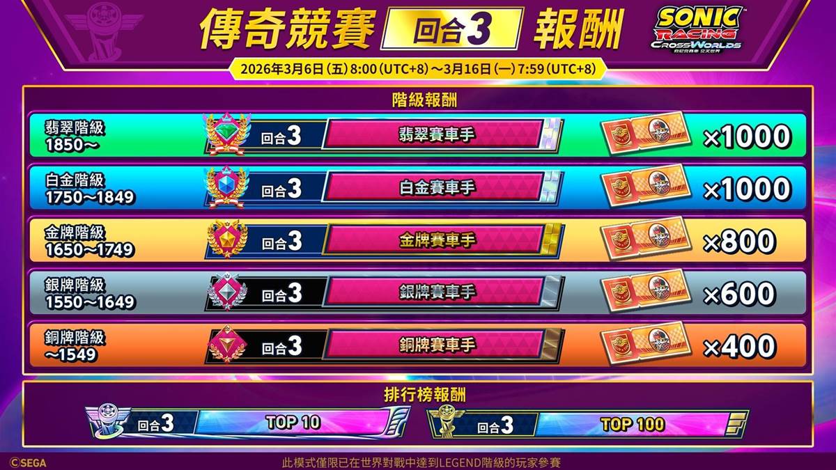 SEGA 世雅宣布,競速賽車遊戲《索尼克賽車 交叉世界》(PS5 / PS4 / Switch 2 / Switch / Xbox Series X|S / Xbox One / PC)將自 3 月 6 日(五)起在遊戲內舉辦頂尖賽車手專用賽事「傳奇競賽 回合 3」。