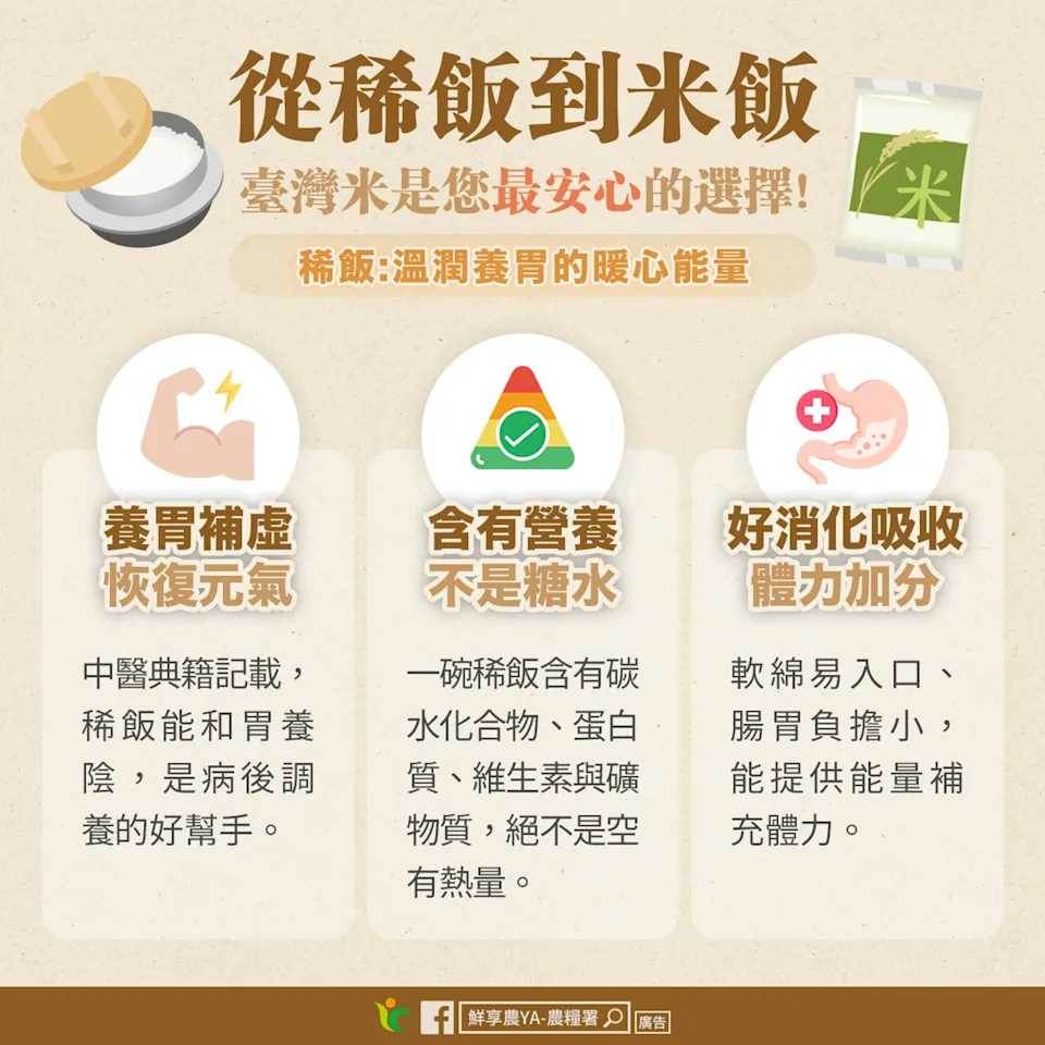 現代人為了追求健康,在飲食上往往會多加留意,特別對「糖」的攝取尤為注意,有不少人認為吃稀飯等于喝糖水,沒營養還讓血糖上升快。對此,農糧署昨(21日)在臉書澄清,認為這樣的說法太過簡化,並引用中醫典籍和現代營養學,肯定稀飯與米湯的價值,是能養胃復元,提供基本營養的食品。