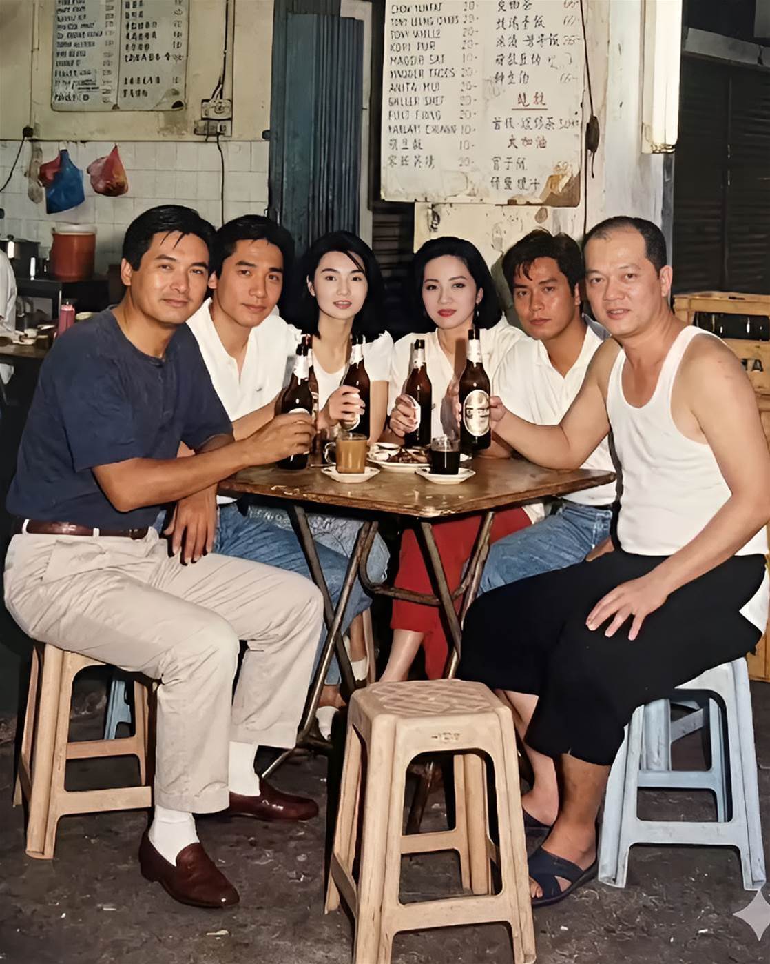 在「明華海鮮飯店」略顯斑駁的牆面前,六位後來叱吒影壇與歌壇的巨星,此刻正像普通人一樣圍坐一桌,享受著朋友相聚的輕鬆時光。