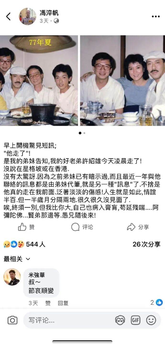 81歲知名演員去世!5天前悼念許紹雄:愚兄隨後來……